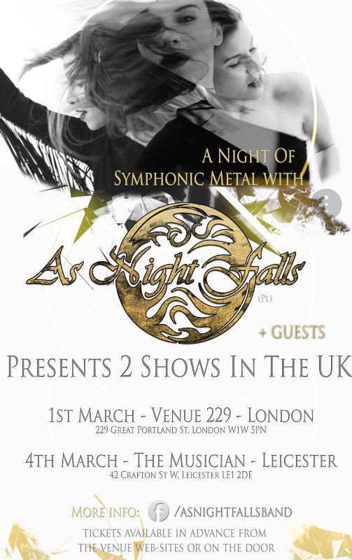 The Rock Service is proud to announce that 'As Night Falls' will tour the UK in 2018. Confirmed dates so far include London on 1st March and Leicester on 4th March, with others being planned. The band hail from Katowice in Poland, and will be bringing their unique blend of Symphonic Rock and Metal to UK shores !!!! Support bands will also be added to the line-up in due course. Check back for details !!!!